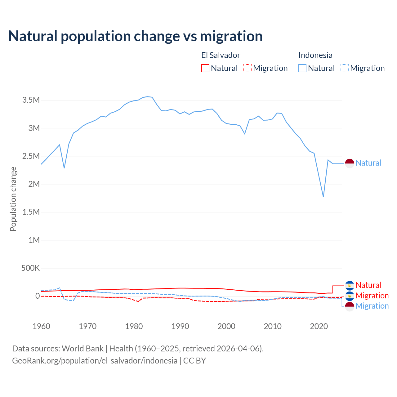 Over the last 10 years, 58.8% of the population change in El Salvador is from natural causes (a gain of 579,641 people) and 41.2% is from migration (a loss of 406,874 people). In Indonesia 98.9% is from natural causes (a gain of 25,242,860 people) and 1.1% is from migration (a loss of 280,258 people).