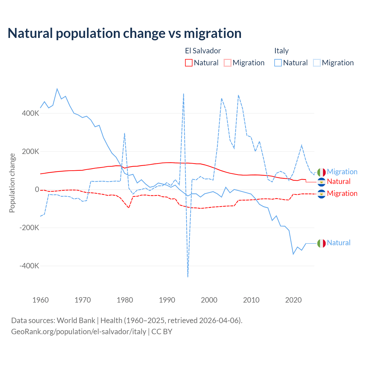 Over the last 10 years, 58.8% of the population change in El Salvador is from natural causes (a gain of 579,641 people) and 41.2% is from migration (a loss of 406,874 people). In Italy 68.6% is from natural causes (a loss of 2,239,084 people) and 31.4% is from migration (a gain of 1,026,128 people).