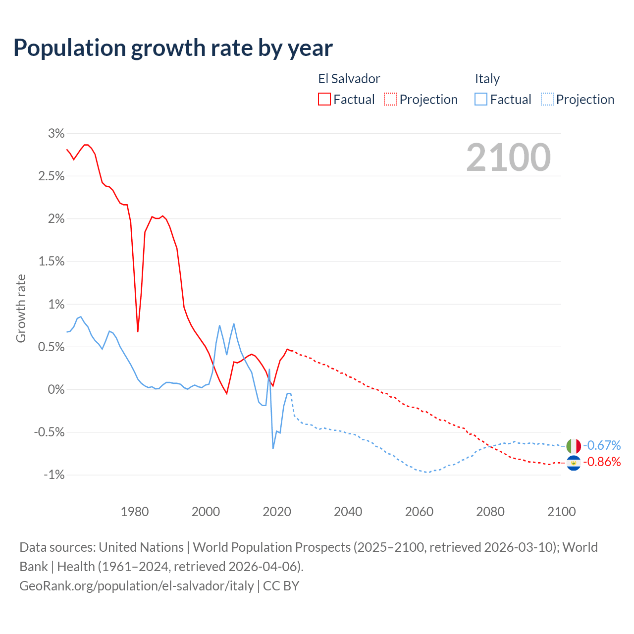 - For the last 10 years, El Salvador has had an average growth rate of +0.29% per year vs -0.21% in Italy.