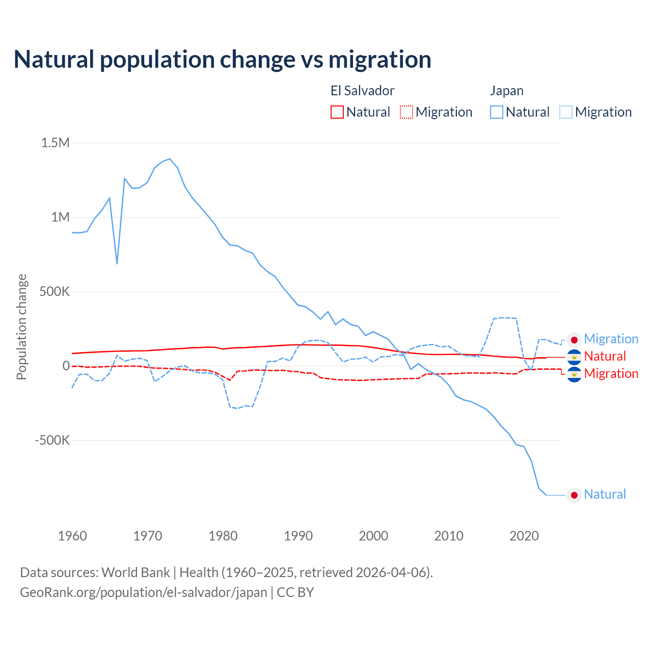 Over the last 10 years, 58.8% of the population change in El Salvador is from natural causes (a gain of 579,641 people) and 41.2% is from migration (a loss of 406,874 people). In Japan 73.6% is from natural causes (a loss of 5,178,838 people) and 26.4% is from migration (a gain of 1,860,103 people).