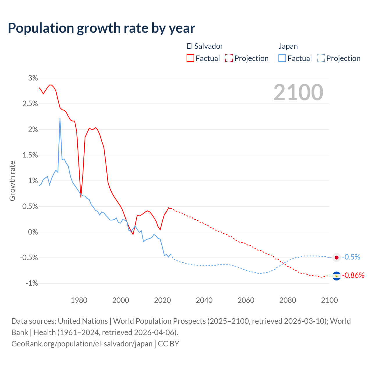 - For the last 10 years, El Salvador has had an average growth rate of +0.29% per year vs -0.25% in Japan.