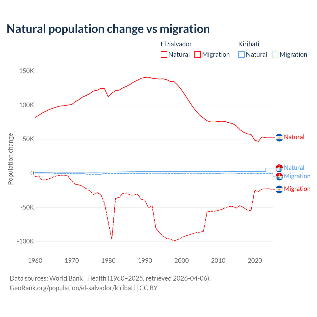 Over the last 10 years, 58.8% of the population change in El Salvador is from natural causes (a gain of 579,641 people) and 41.2% is from migration (a loss of 406,874 people). In Kiribati 80% is from natural causes (a gain of 25,262 people) and 20% is from migration (a loss of 6,330 people).