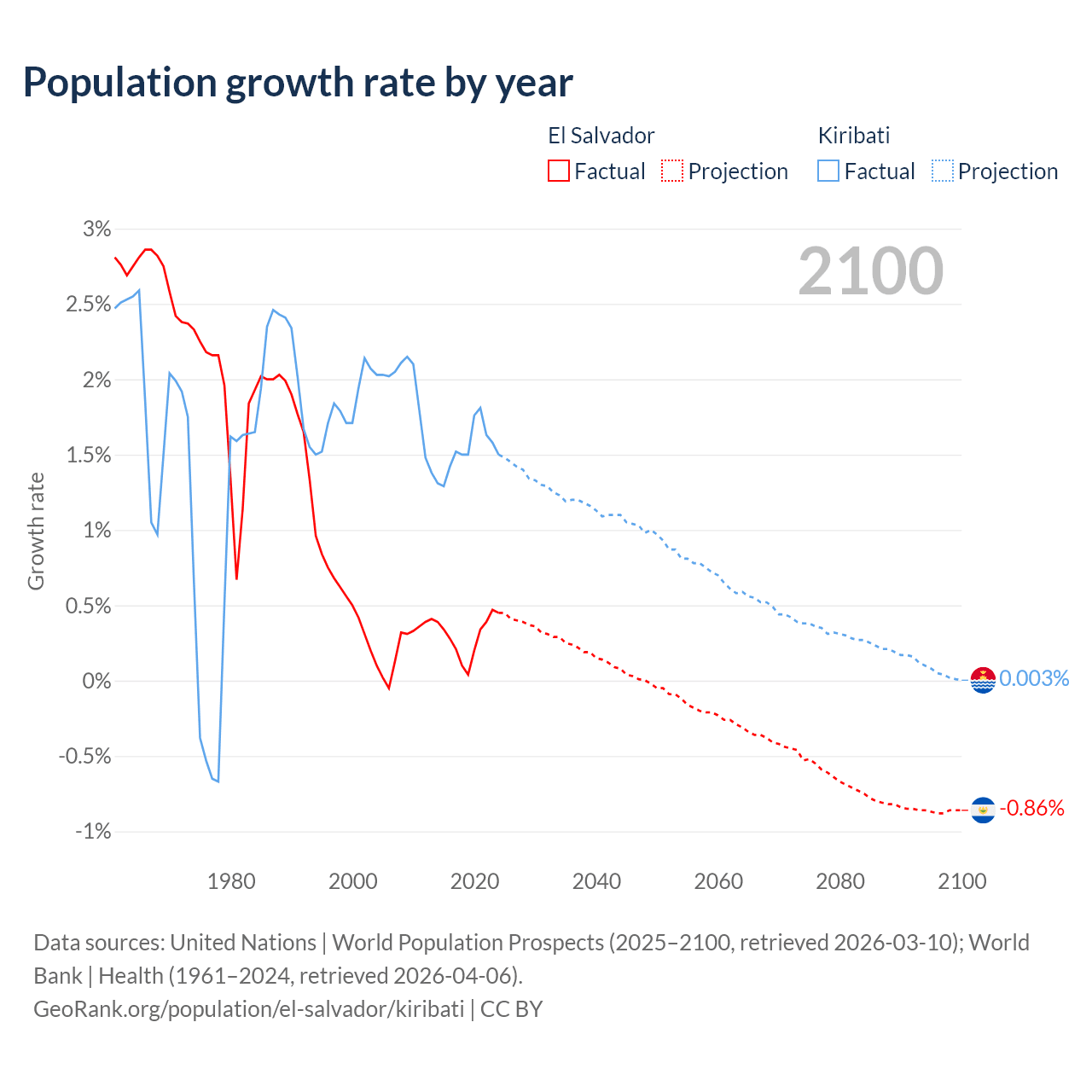 El Salvador vs Kiribati: population by year and forecast