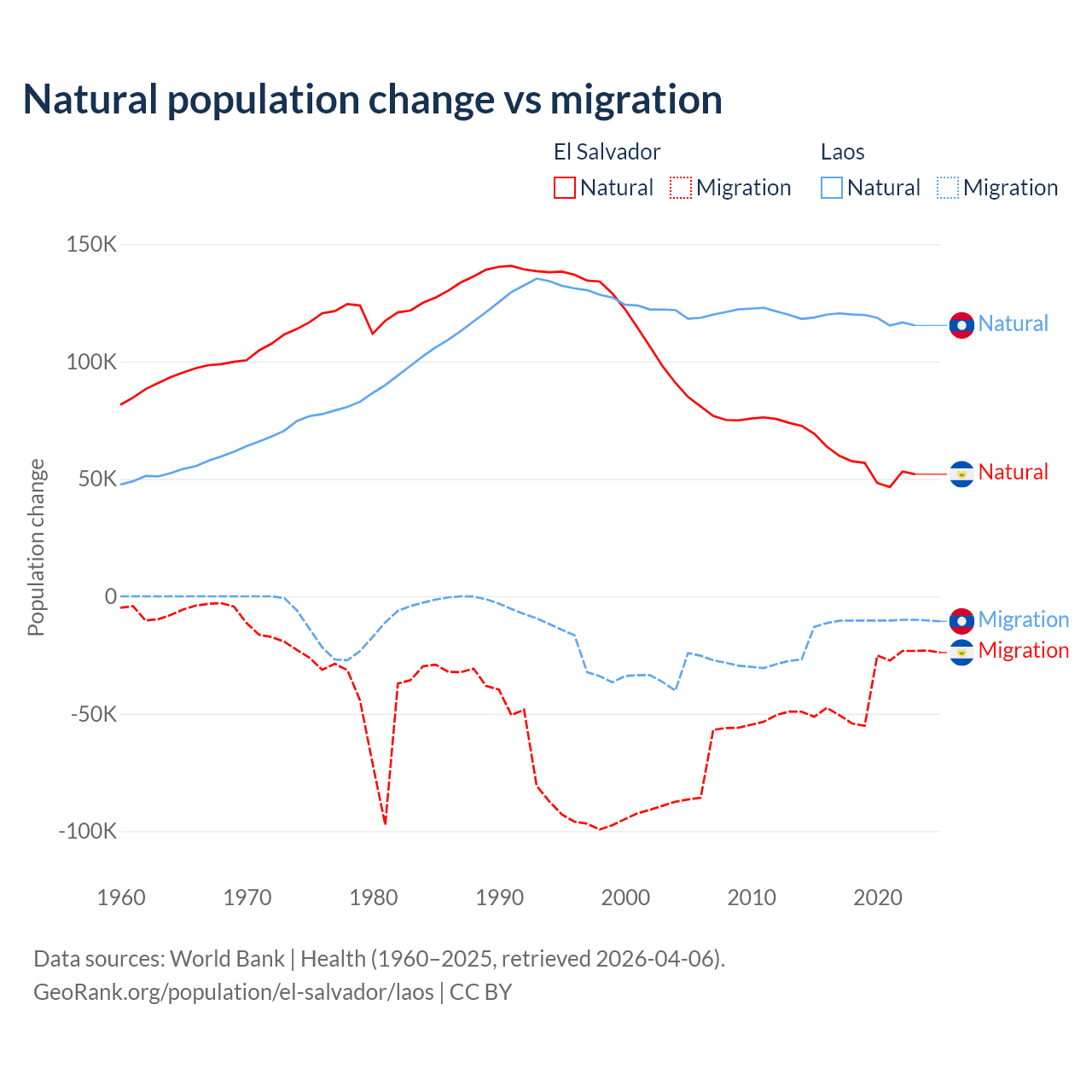 Over the last 10 years, 58.8% of the population change in El Salvador is from natural causes (a gain of 579,641 people) and 41.2% is from migration (a loss of 406,874 people). In Laos 90.6% is from natural causes (a gain of 1,183,013 people) and 9.41% is from migration (a loss of 122,899 people).