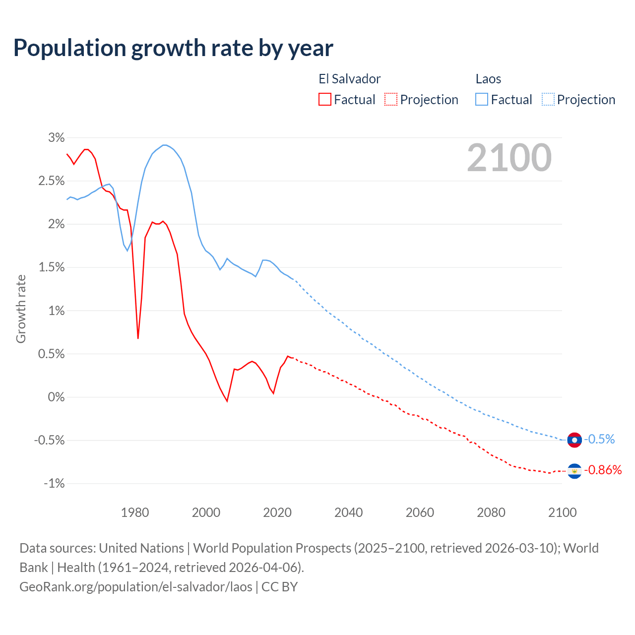 - For the last 10 years, El Salvador has had an average growth rate of +0.29% per year vs +1.48% in Laos.