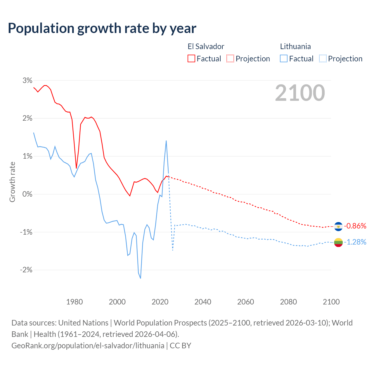 - For the last 10 years, El Salvador has had an average growth rate of +0.29% per year vs -0.22% in Lithuania.
