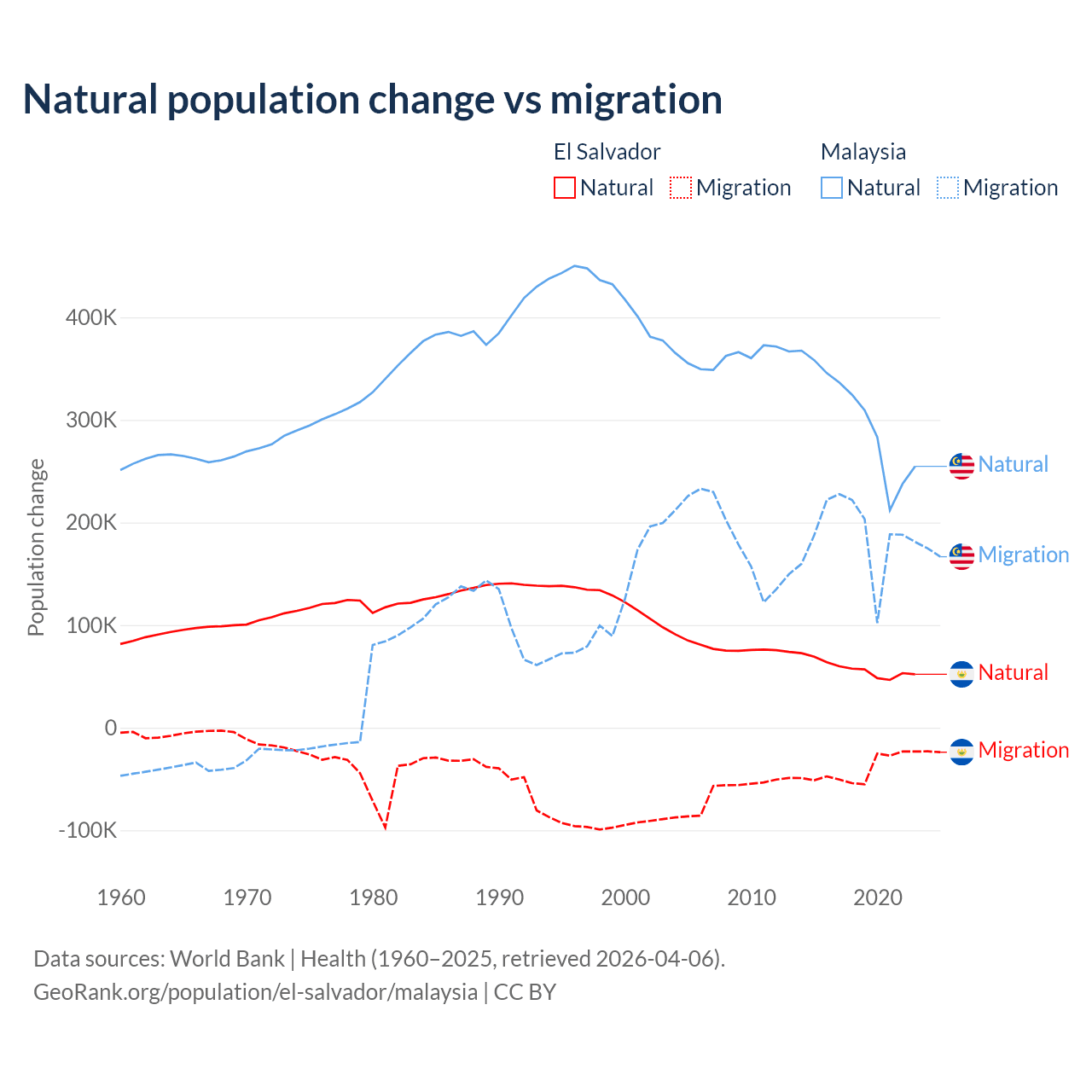 Over the last 10 years, 58.8% of the population change in El Salvador is from natural causes (a gain of 579,641 people) and 41.2% is from migration (a loss of 406,874 people). In Malaysia 61.7% is from natural causes (a gain of 3,029,648 people) and 38.3% is from migration (a gain of 1,882,159 people).