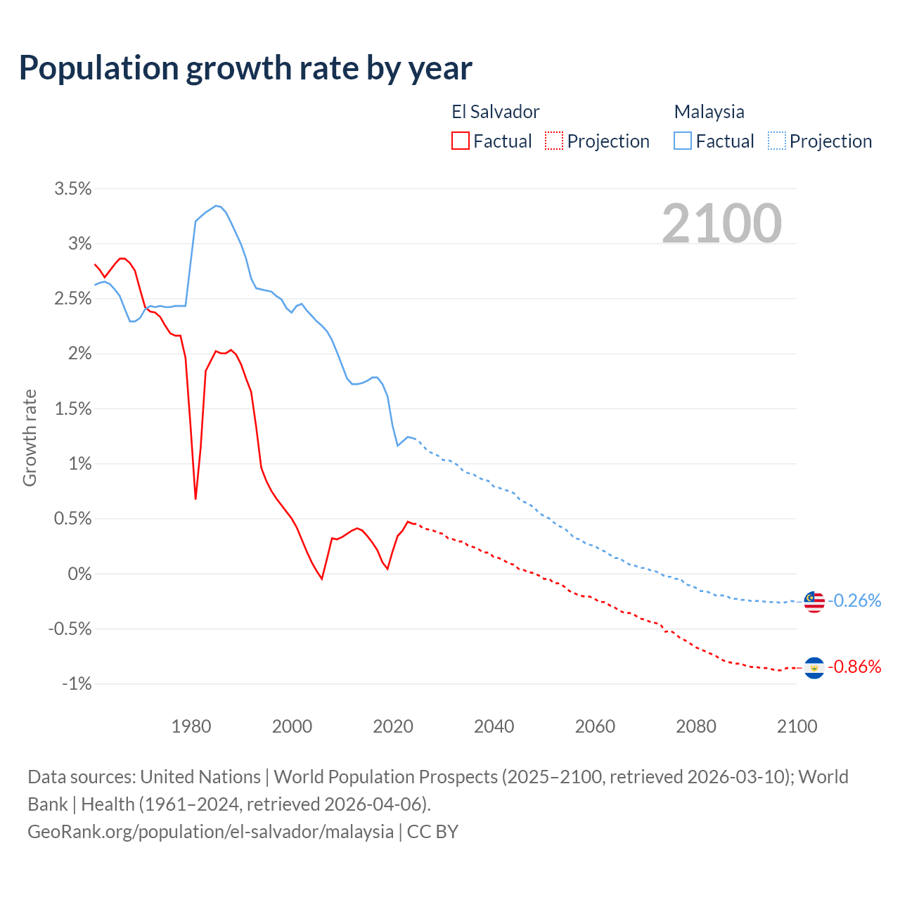 El Salvador vs Malaysia: population by year and forecast