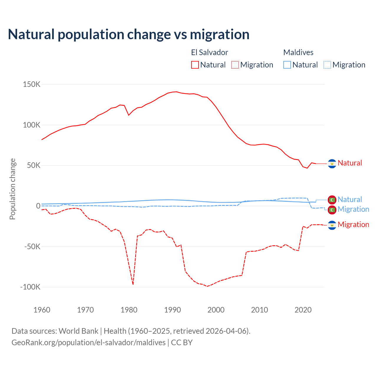 Over the last 10 years, 58.8% of the population change in El Salvador is from natural causes (a gain of 579,641 people) and 41.2% is from migration (a loss of 406,874 people). In Maldives 42.7% is from natural causes (a gain of 51,342 people) and 57.3% is from migration (a gain of 68,788 people).