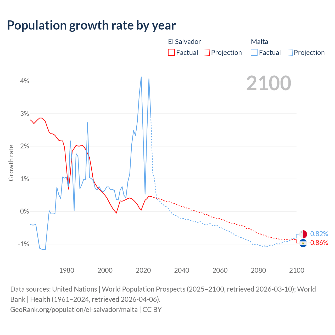- For the last 10 years, El Salvador has had an average growth rate of +0.29% per year vs +2.69% in Malta.