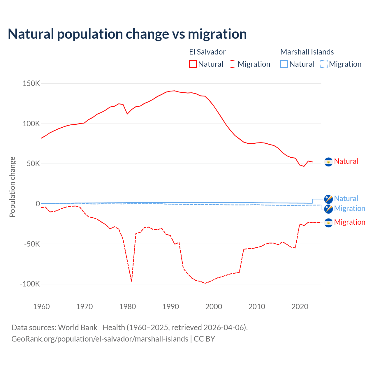 Over the last 10 years, 58.8% of the population change in El Salvador is from natural causes (a gain of 579,641 people) and 41.2% is from migration (a loss of 406,874 people). In the Marshall Islands 27.8% is from natural causes (a gain of 7,592 people) and 72.2% is from migration (a loss of 19,682 people).