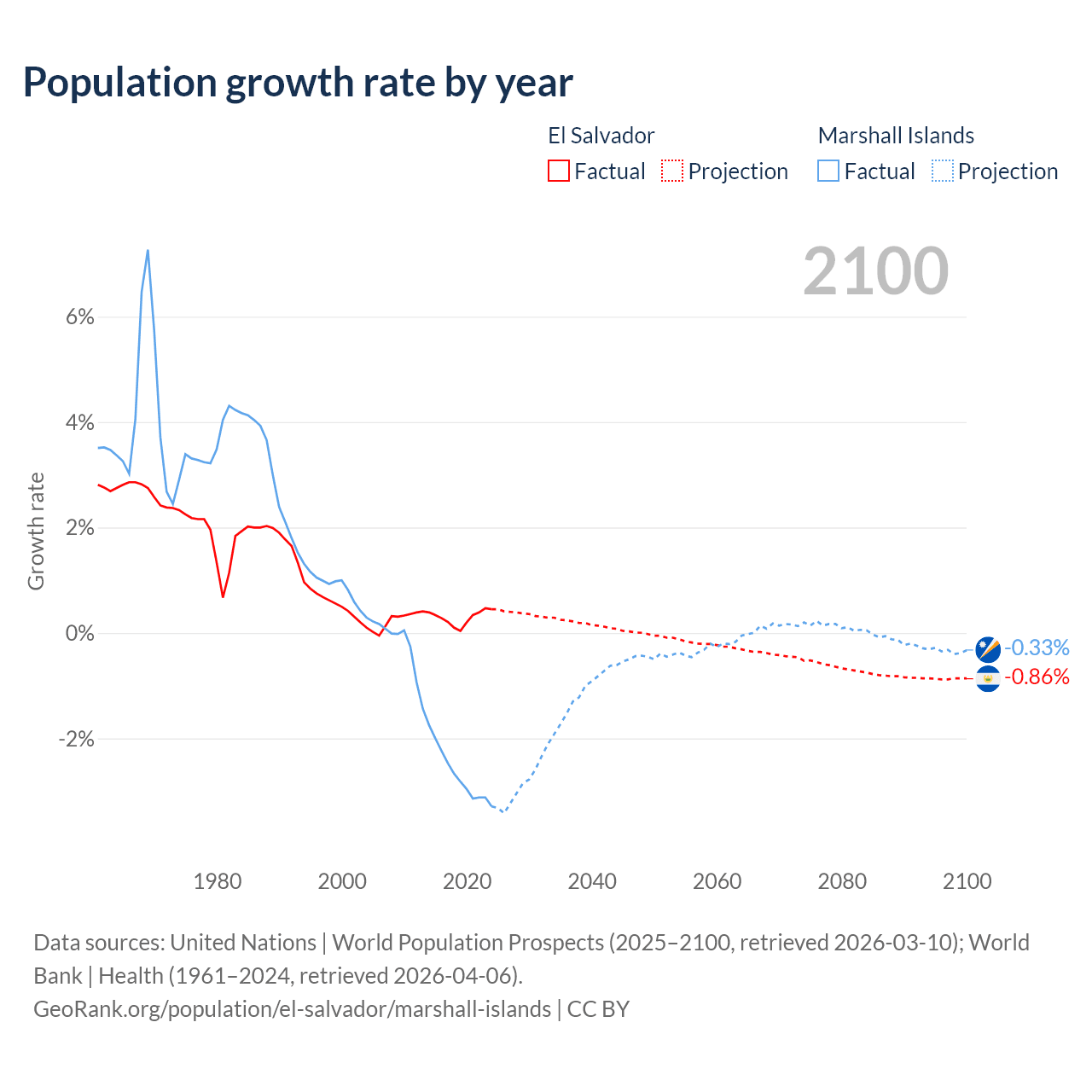 - For the last 10 years, El Salvador has had an average growth rate of +0.29% per year vs -2.69% in the Marshall Islands.