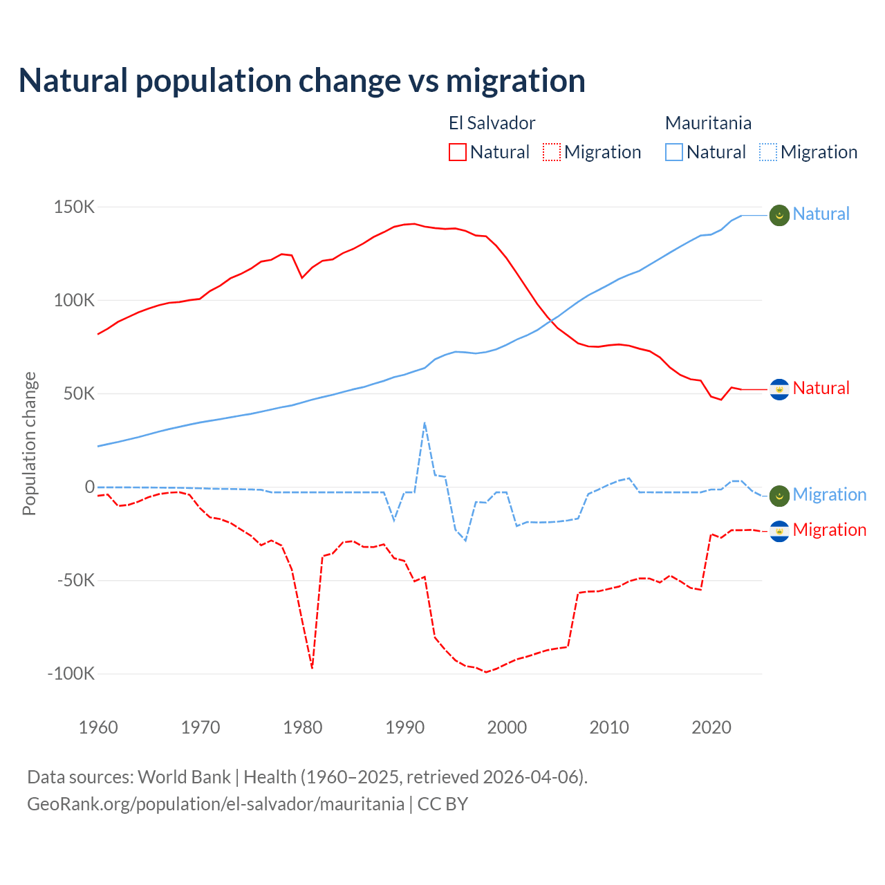 Over the last 10 years, 58.8% of the population change in El Salvador is from natural causes (a gain of 579,641 people) and 41.2% is from migration (a loss of 406,874 people). In Mauritania 98.9% is from natural causes (a gain of 1,320,903 people) and 1.12% is from migration (a loss of 14,982 people).