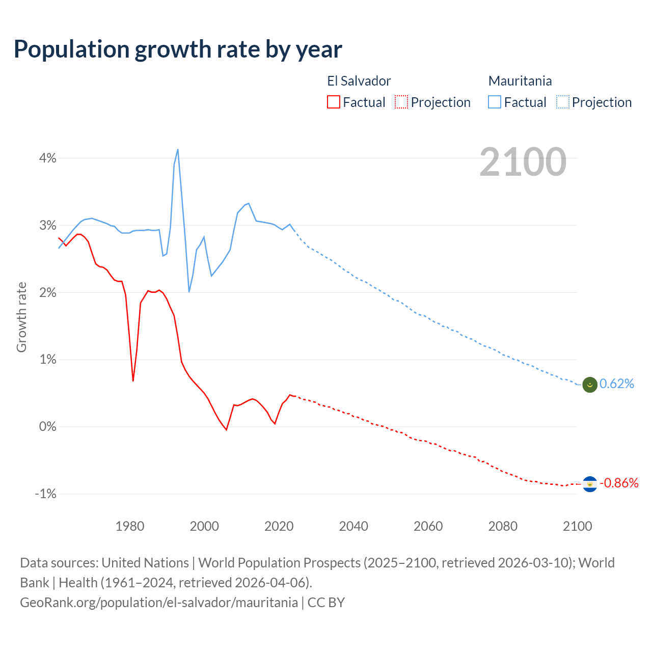 - For the last 10 years, El Salvador has had an average growth rate of +0.29% per year vs +3% in Mauritania.