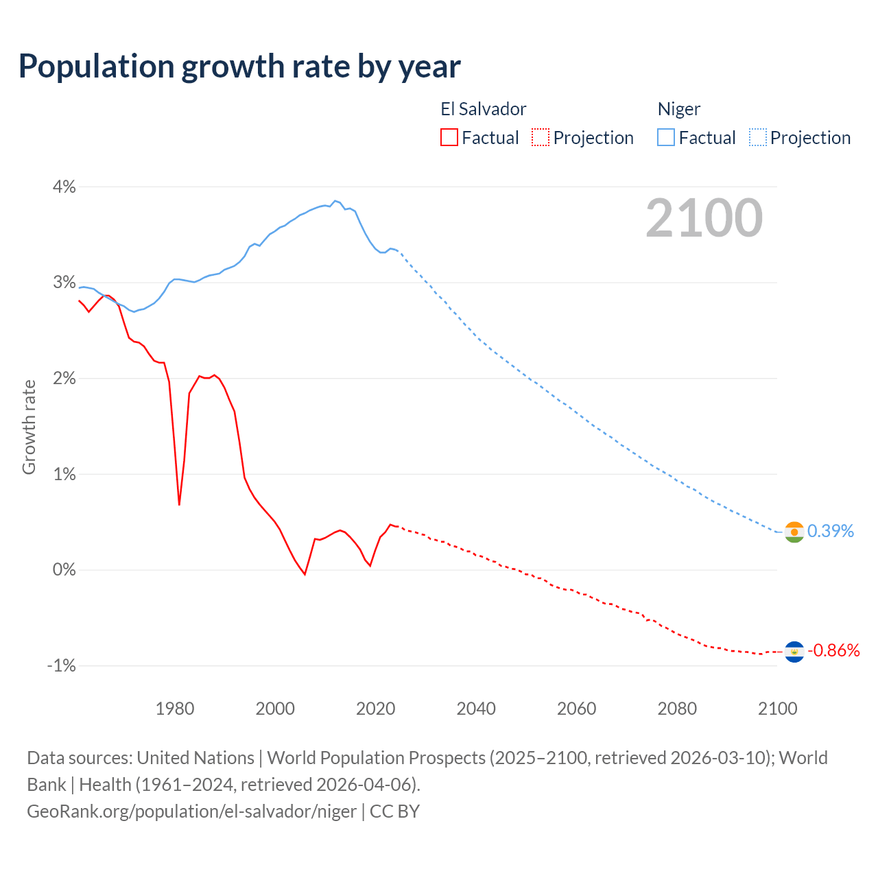 - For the last 10 years, El Salvador has had an average growth rate of +0.29% per year vs +3.5% in Niger.