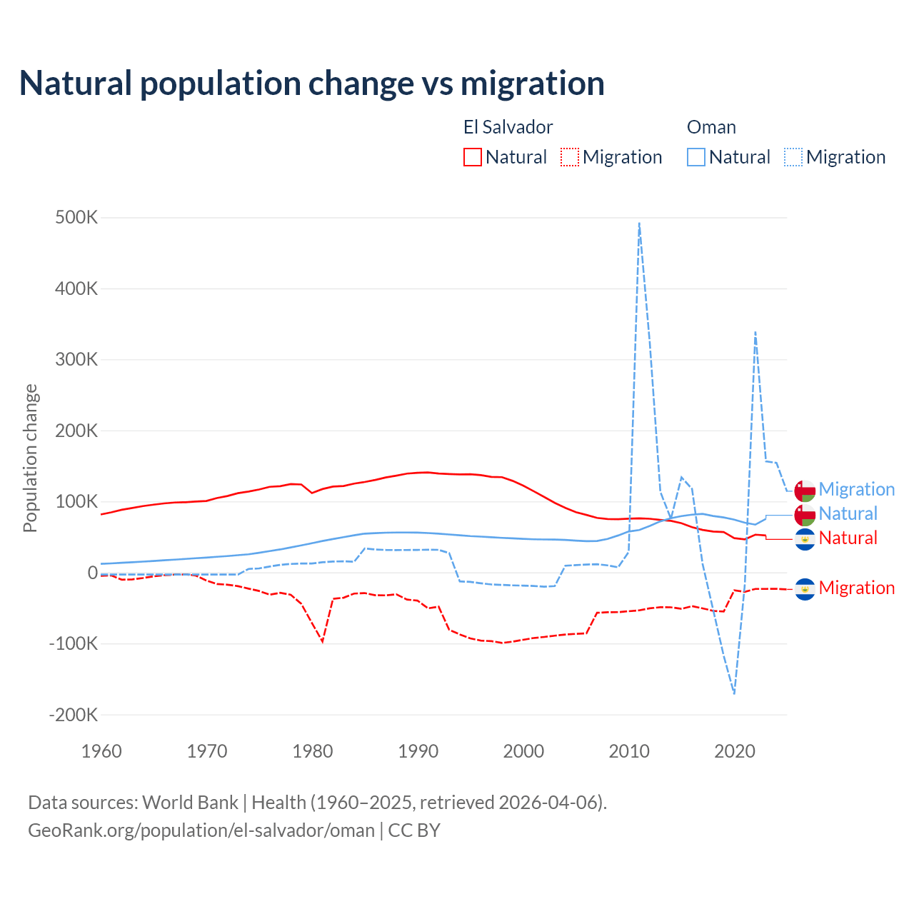 Over the last 10 years, 58.8% of the population change in El Salvador is from natural causes (a gain of 579,641 people) and 41.2% is from migration (a loss of 406,874 people). In Oman 61.6% is from natural causes (a gain of 763,049 people) and 38.4% is from migration (a gain of 475,565 people).