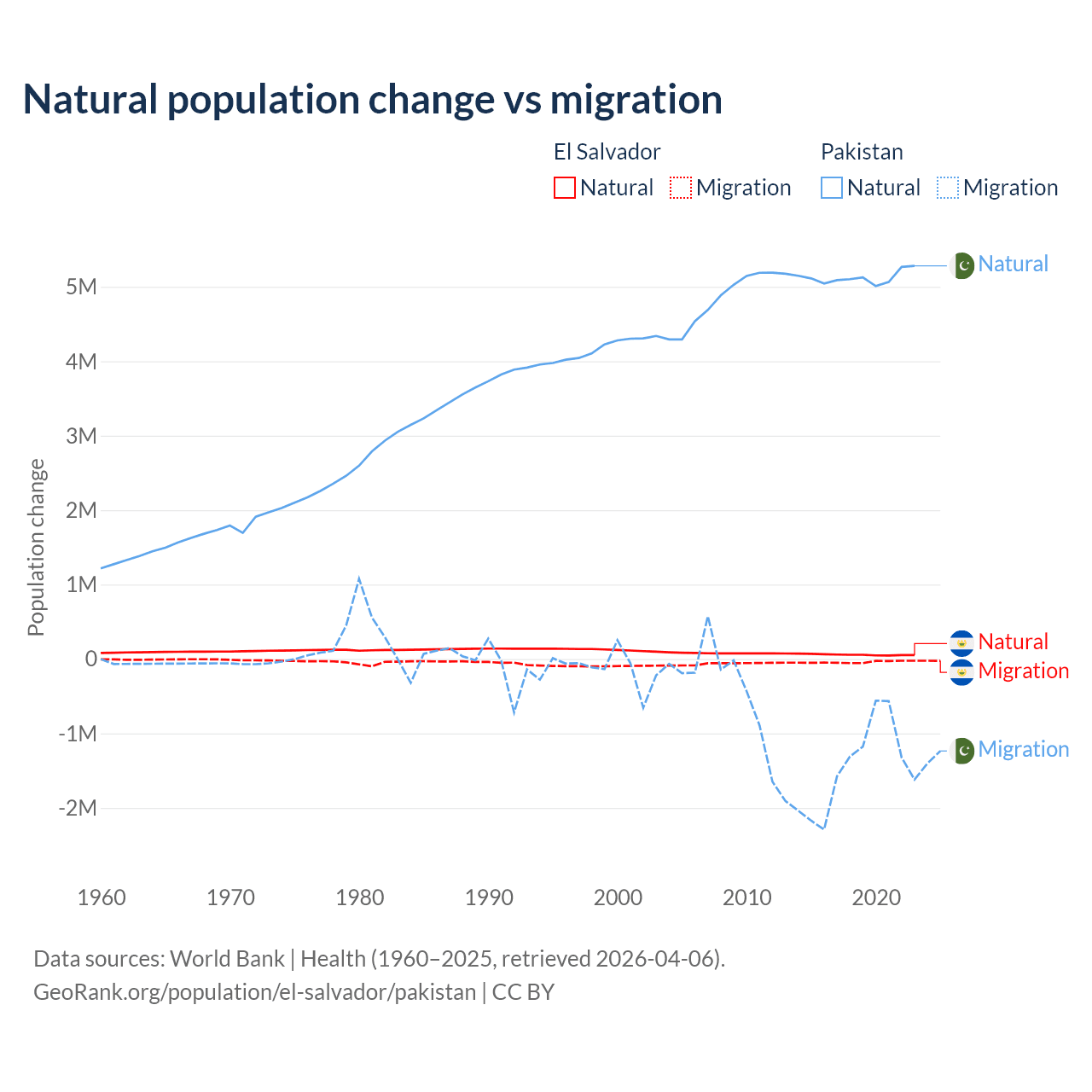 Over the last 10 years, 58.8% of the population change in El Salvador is from natural causes (a gain of 579,641 people) and 41.2% is from migration (a loss of 406,874 people). In Pakistan 77.8% is from natural causes (a gain of 51,255,404 people) and 22.2% is from migration (a loss of 14,629,055 people).
