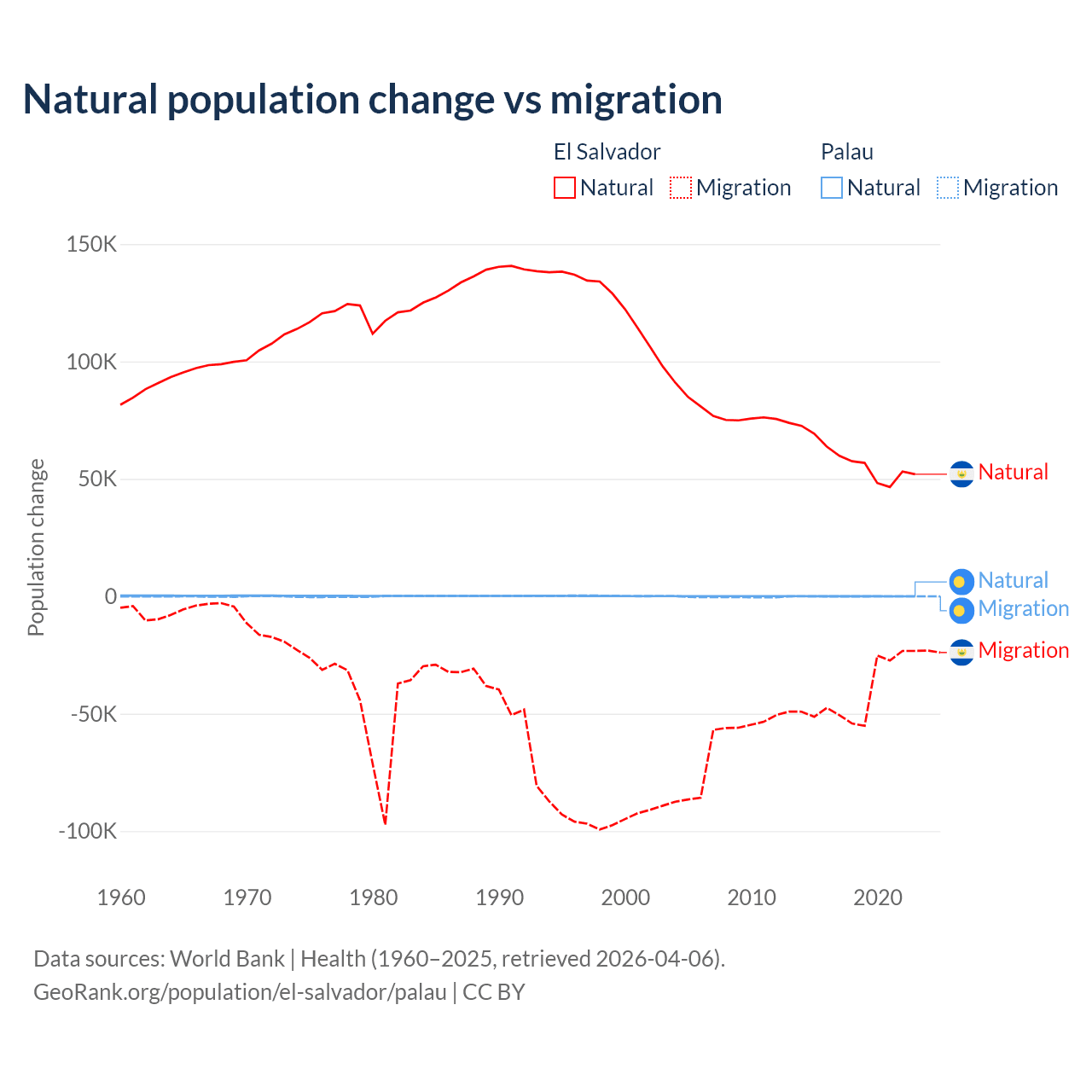 Over the last 10 years, 58.8% of the population change in El Salvador is from natural causes (a gain of 579,641 people) and 41.2% is from migration (a loss of 406,874 people). In Palau 53.8% is from natural causes (a gain of 264 people) and 46.2% is from migration (a loss of 227 people).