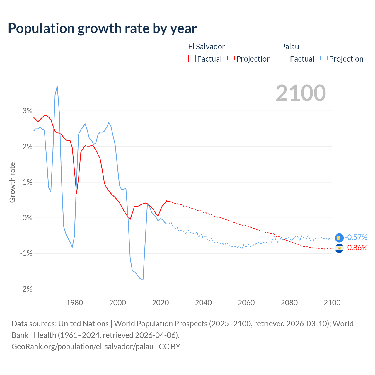 - For the last 10 years, El Salvador has had an average growth rate of +0.29% per year vs +0.02% in Palau.
