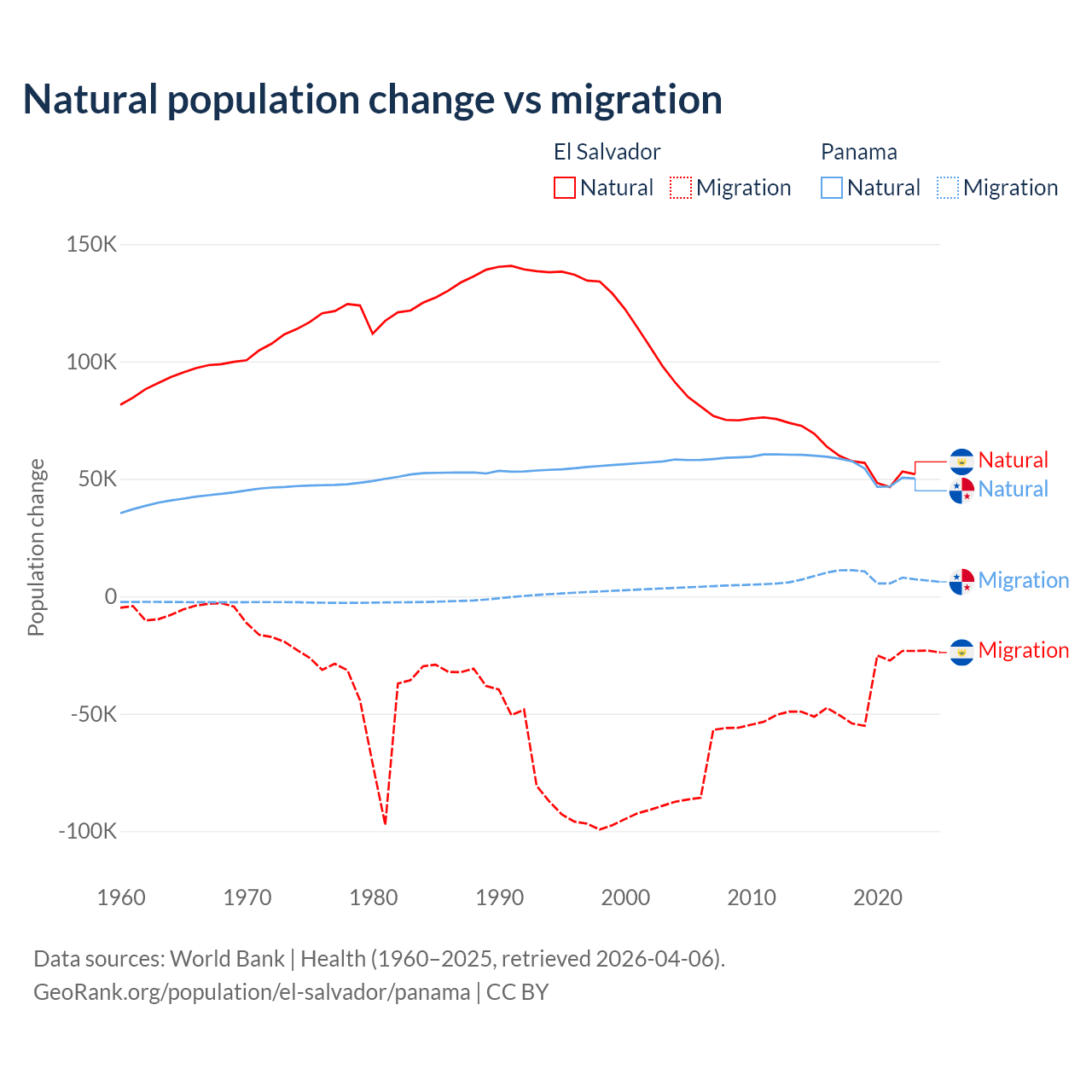 Over the last 10 years, 58.8% of the population change in El Salvador is from natural causes (a gain of 579,641 people) and 41.2% is from migration (a loss of 406,874 people). In Panama 86.5% is from natural causes (a gain of 544,211 people) and 13.5% is from migration (a gain of 84,849 people).