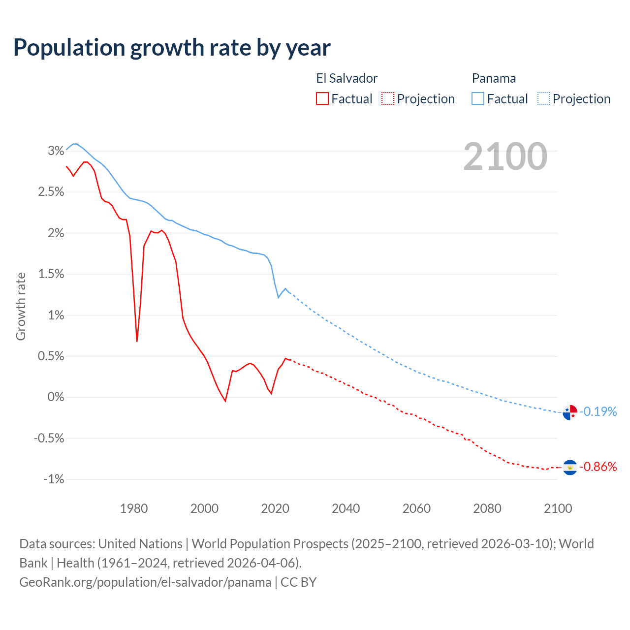 - For the last 10 years, El Salvador has had an average growth rate of +0.29% per year vs +1.52% in Panama.