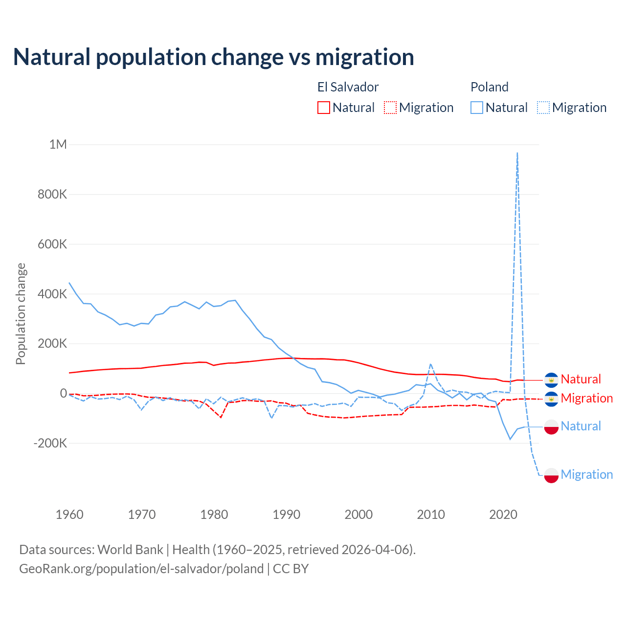 Over the last 10 years, 58.8% of the population change in El Salvador is from natural causes (a gain of 579,641 people) and 41.2% is from migration (a loss of 406,874 people). In Poland 41.4% is from natural causes (a loss of 675,443 people) and 58.6% is from migration (a gain of 955,766 people).