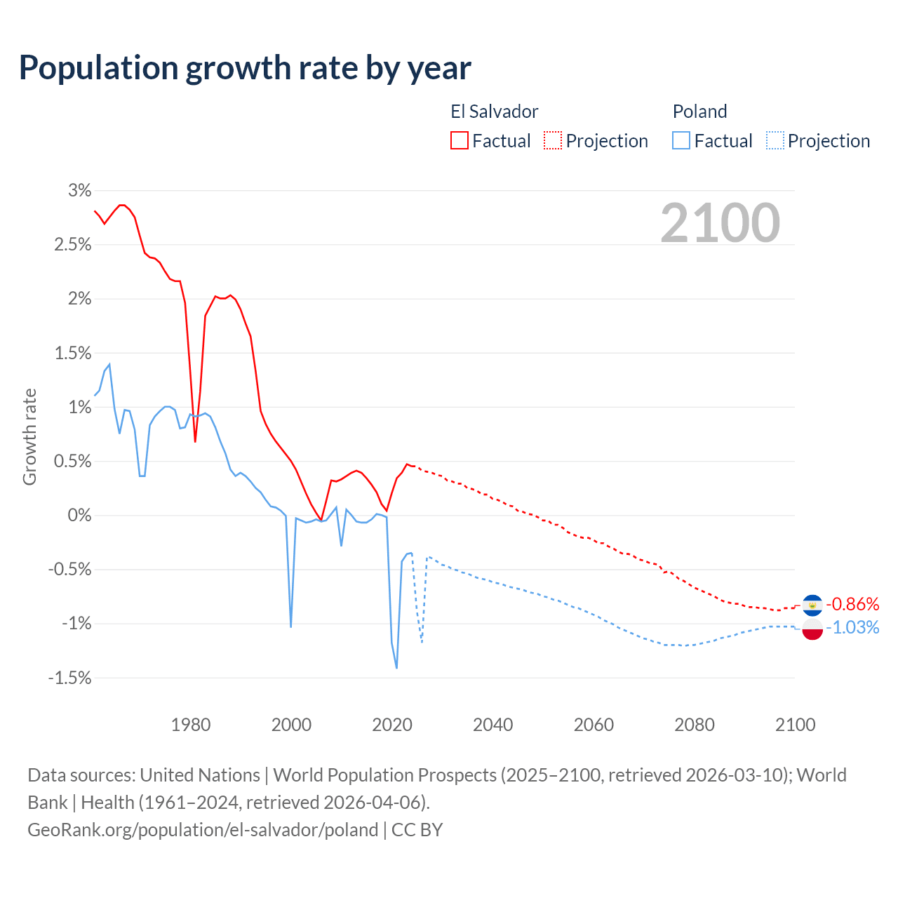 - For the last 10 years, El Salvador has had an average growth rate of +0.29% per year vs -0.36% in Poland.