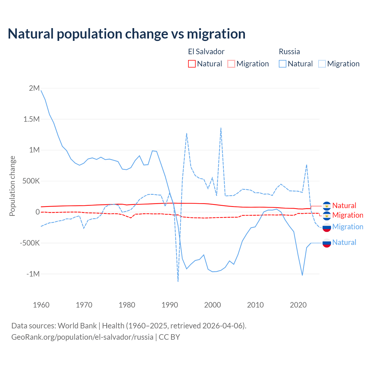 Over the last 10 years, 58.8% of the population change in El Salvador is from natural causes (a gain of 579,641 people) and 41.2% is from migration (a loss of 406,874 people). In Russia 48.6% is from natural causes (a loss of 3,416,377 people) and 51.4% is from migration (a gain of 3,611,826 people).