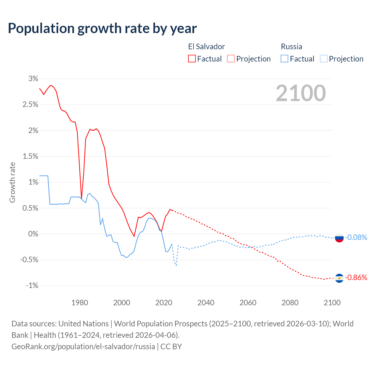 - For the last 10 years, El Salvador has had an average growth rate of +0.29% per year vs -0.02% in Russia.