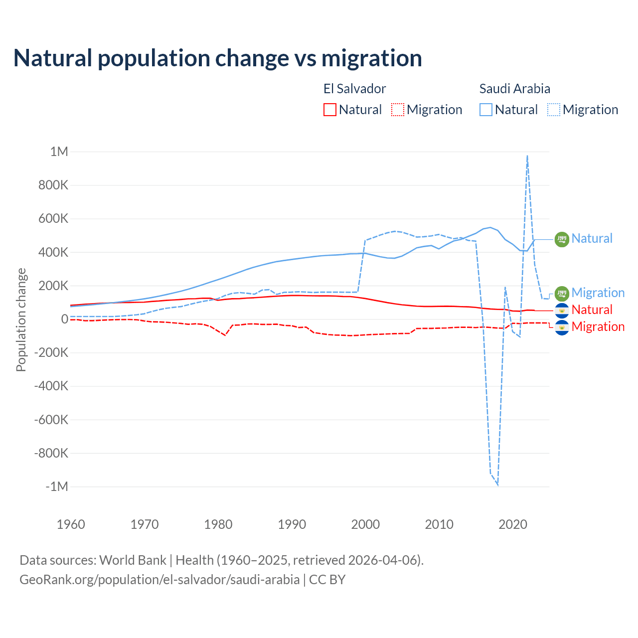 Over the last 10 years, 58.8% of the population change in El Salvador is from natural causes (a gain of 579,641 people) and 41.2% is from migration (a loss of 406,874 people). In Saudi Arabia 93.9% is from natural causes (a gain of 4,829,562 people) and 6.05% is from migration (a gain of 311,209 people).