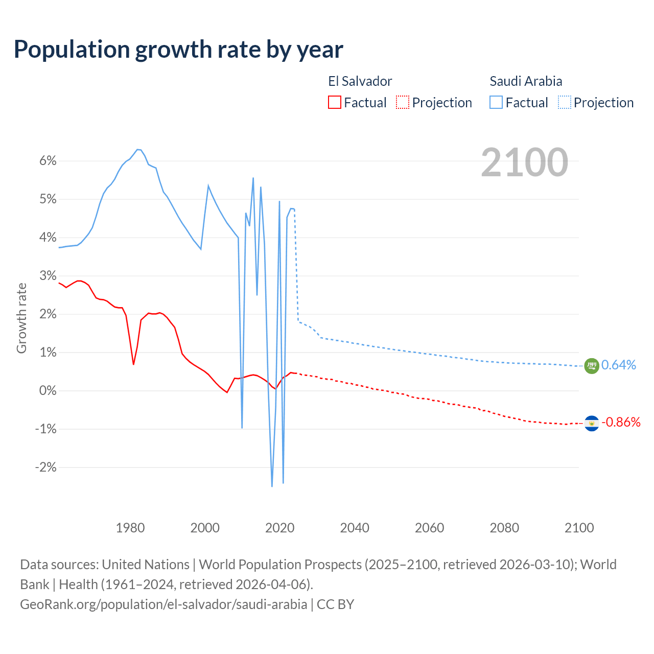 - For the last 10 years, El Salvador has had an average growth rate of +0.29% per year vs +2.3% in Saudi Arabia.