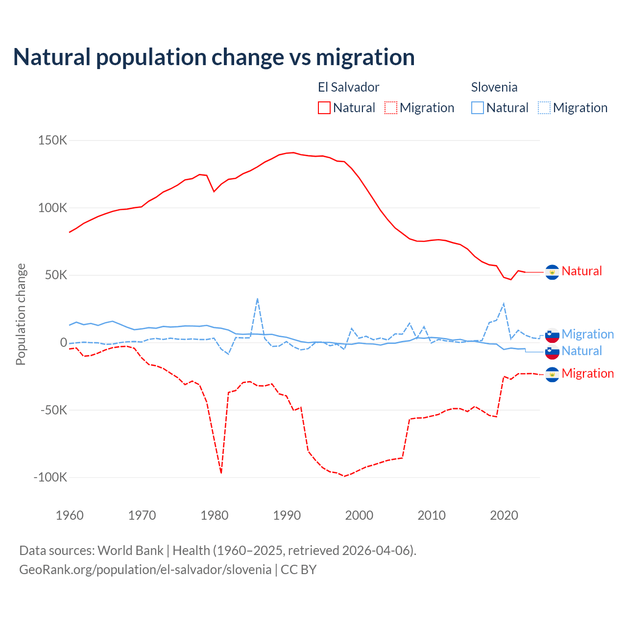 Over the last 10 years, 58.8% of the population change in El Salvador is from natural causes (a gain of 579,641 people) and 41.2% is from migration (a loss of 406,874 people). In Slovenia 18.1% is from natural causes (a loss of 17,573 people) and 81.9% is from migration (a gain of 79,532 people).