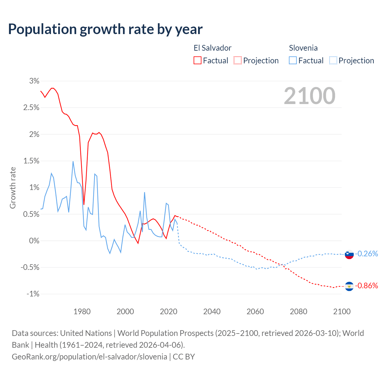 El Salvador vs Slovenia: population by year and forecast