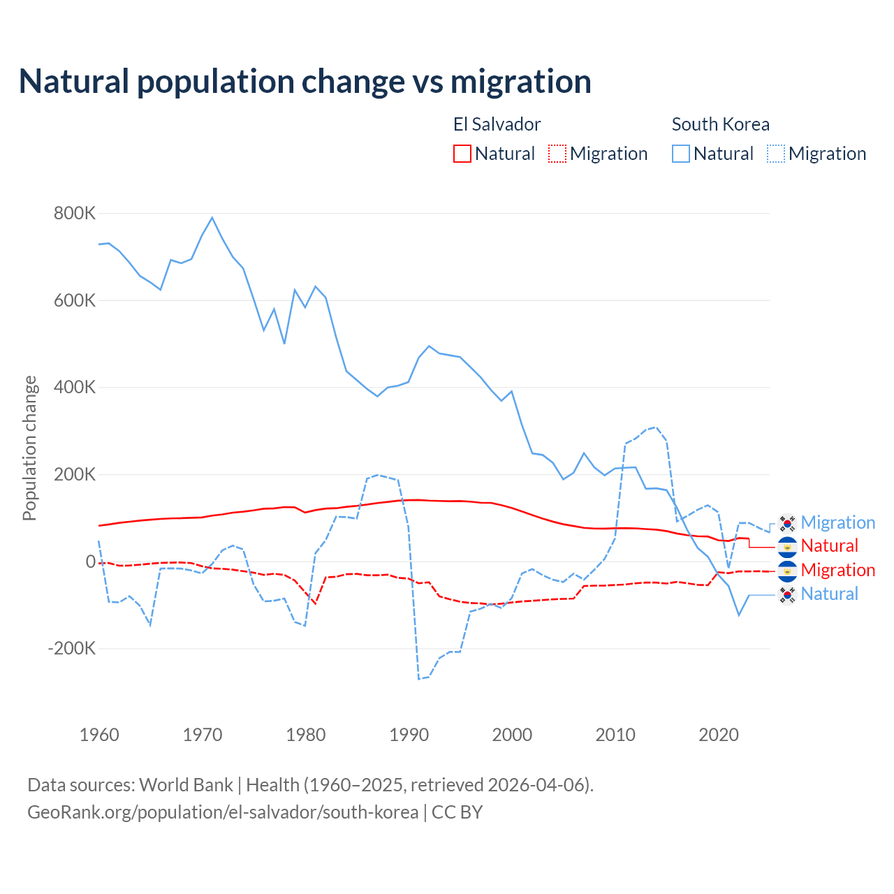 Over the last 10 years, 58.8% of the population change in El Salvador is from natural causes (a gain of 579,641 people) and 41.2% is from migration (a loss of 406,874 people). In South Korea 17.6% is from natural causes (a gain of 277,215 people) and 82.4% is from migration (a gain of 1,298,356 people).