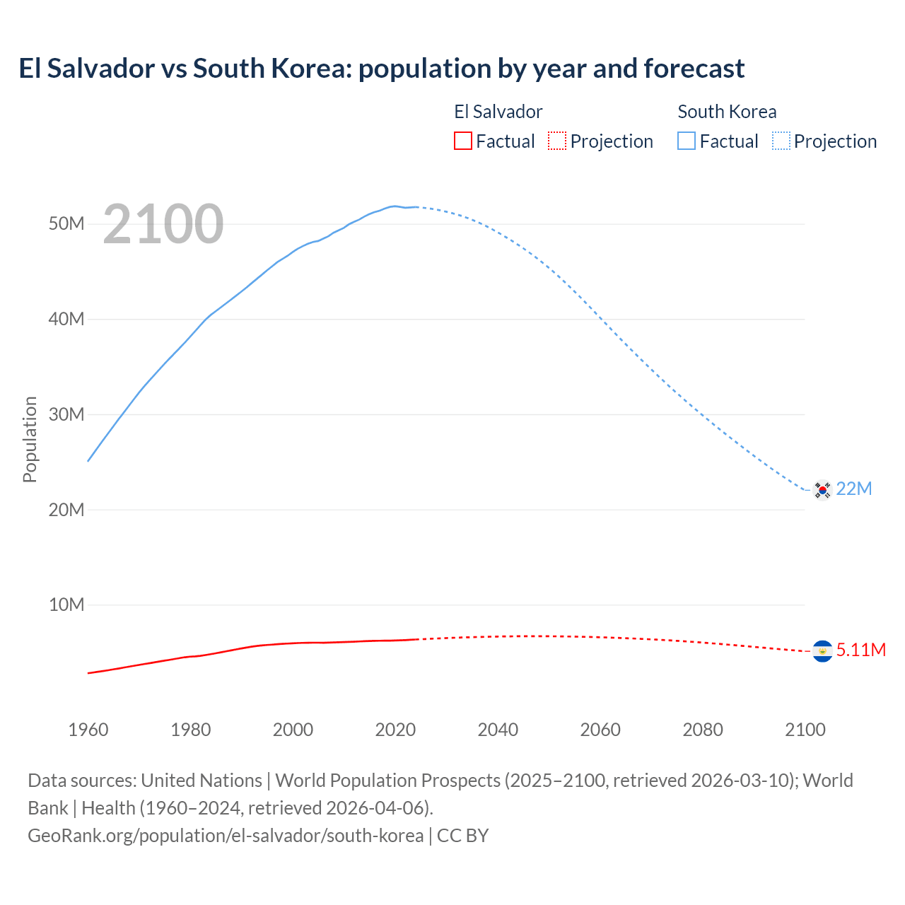 The latest officially reported population of El Salvador was 6,338,193 in 2024 vs 51,751,065 people in South Korea in 2024. In 2026, based on the adjusted UN estimation, the current El Salvador's population is 6,399,793 people compared to 51,649,918 in South Korea.