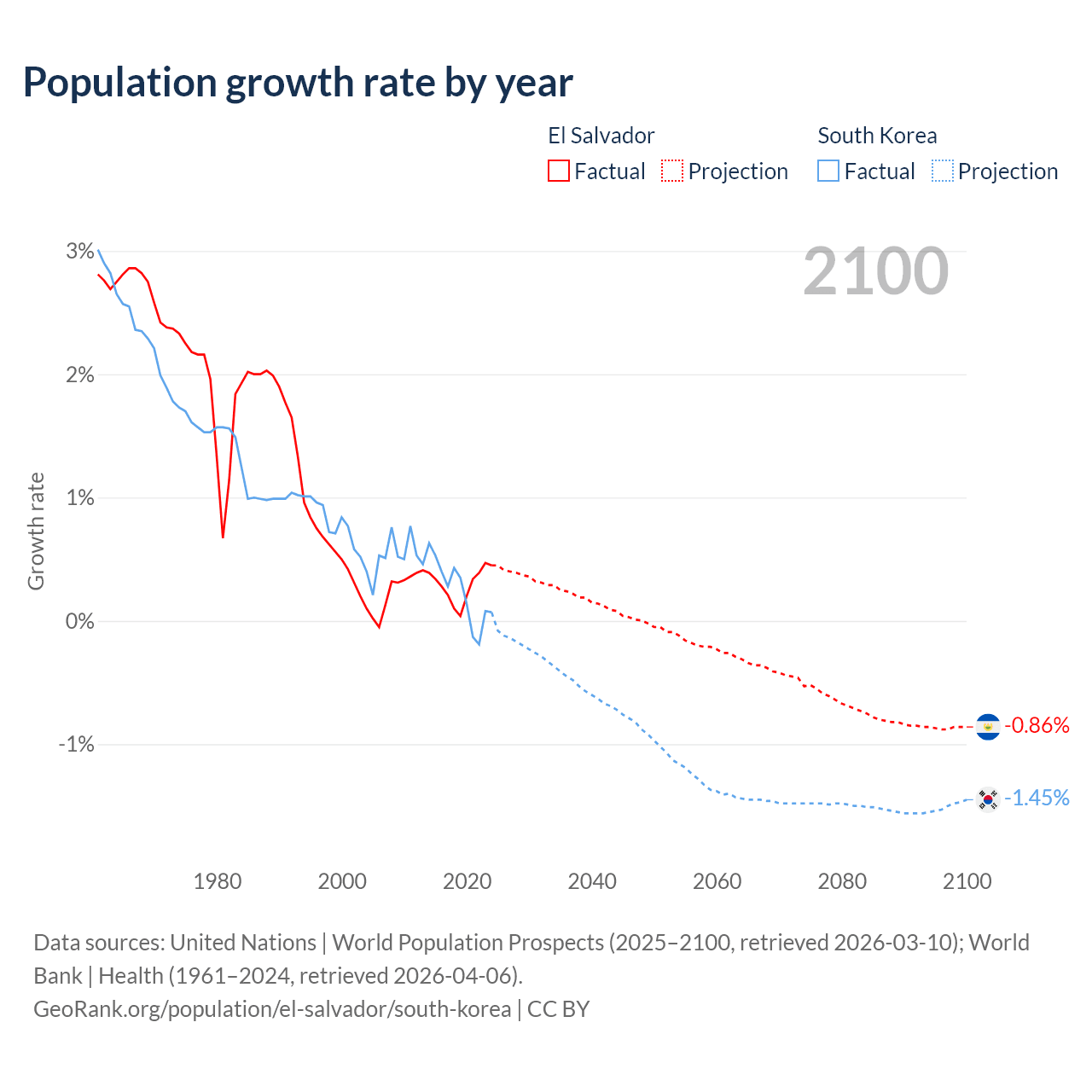 - For the last 10 years, El Salvador has had an average growth rate of +0.29% per year vs +0.24% in South Korea.
