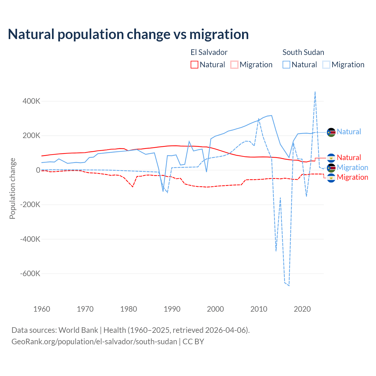 Over the last 10 years, 58.8% of the population change in El Salvador is from natural causes (a gain of 579,641 people) and 41.2% is from migration (a loss of 406,874 people). In South Sudan 57.4% is from natural causes (a gain of 1,792,135 people) and 42.6% is from migration (a loss of 1,329,606 people).