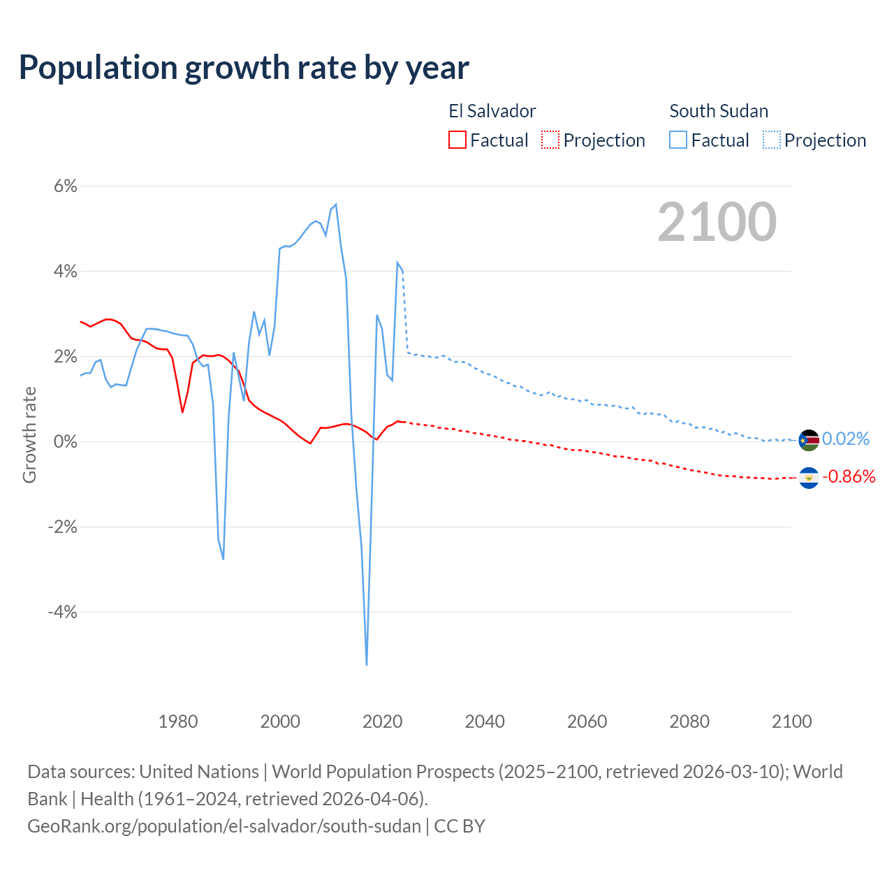 - For the last 10 years, El Salvador has had an average growth rate of +0.29% per year vs +0.65% in South Sudan.