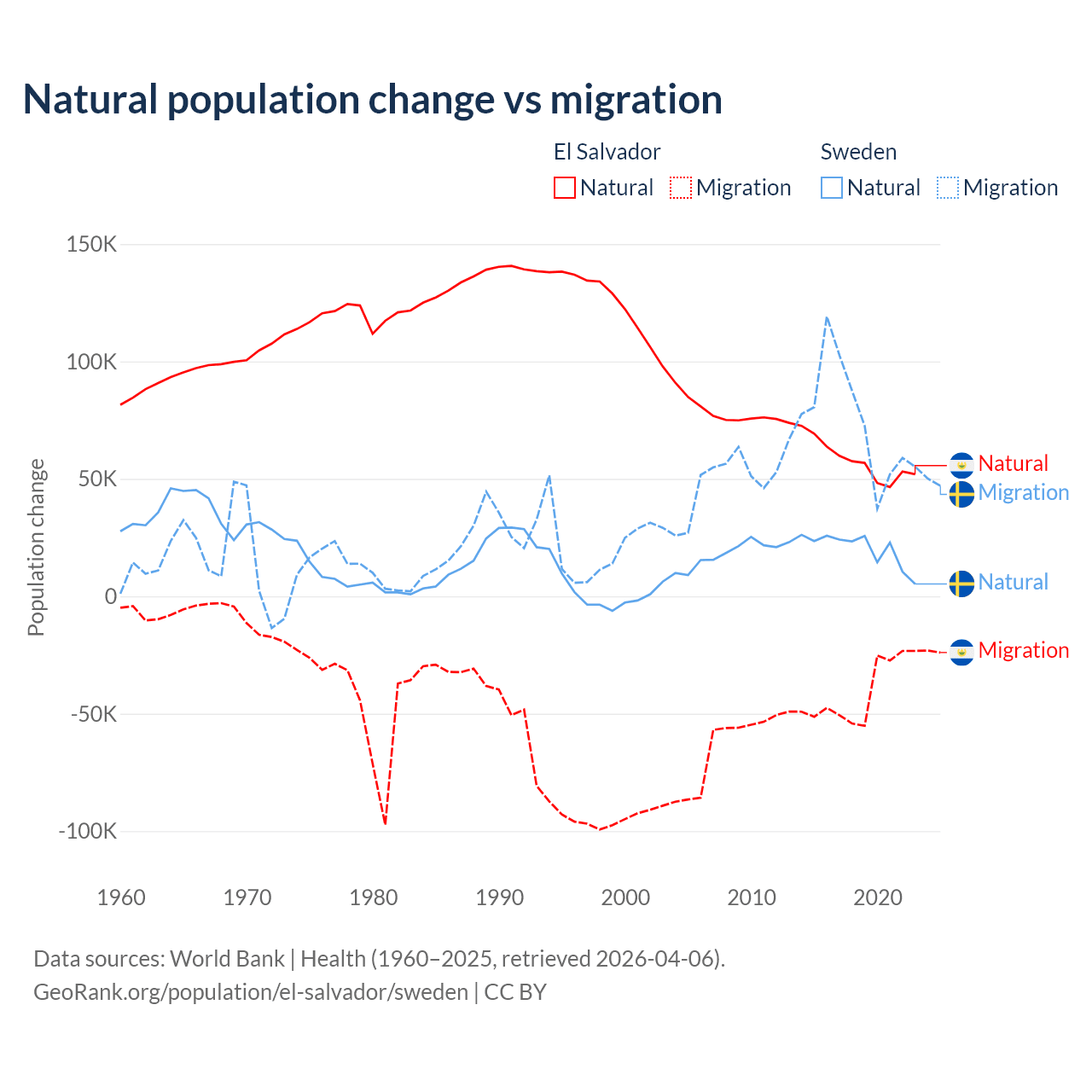 Over the last 10 years, 58.8% of the population change in El Salvador is from natural causes (a gain of 579,641 people) and 41.2% is from migration (a loss of 406,874 people). In Sweden 21.4% is from natural causes (a gain of 201,900 people) and 78.6% is from migration (a gain of 743,642 people).