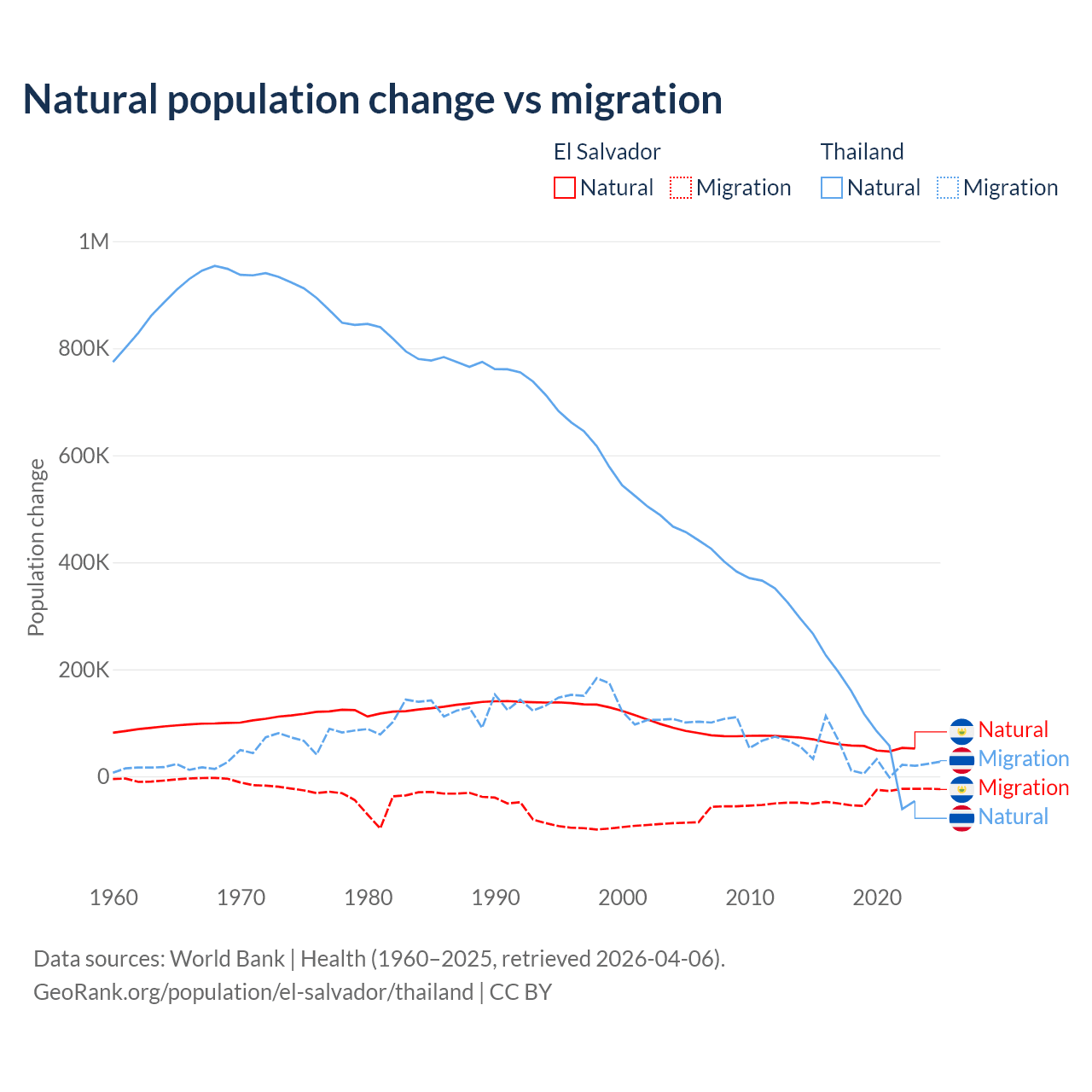 Over the last 10 years, 58.8% of the population change in El Salvador is from natural causes (a gain of 579,641 people) and 41.2% is from migration (a loss of 406,874 people). In Thailand 78.4% is from natural causes (a gain of 1,292,528 people) and 21.6% is from migration (a gain of 355,361 people).