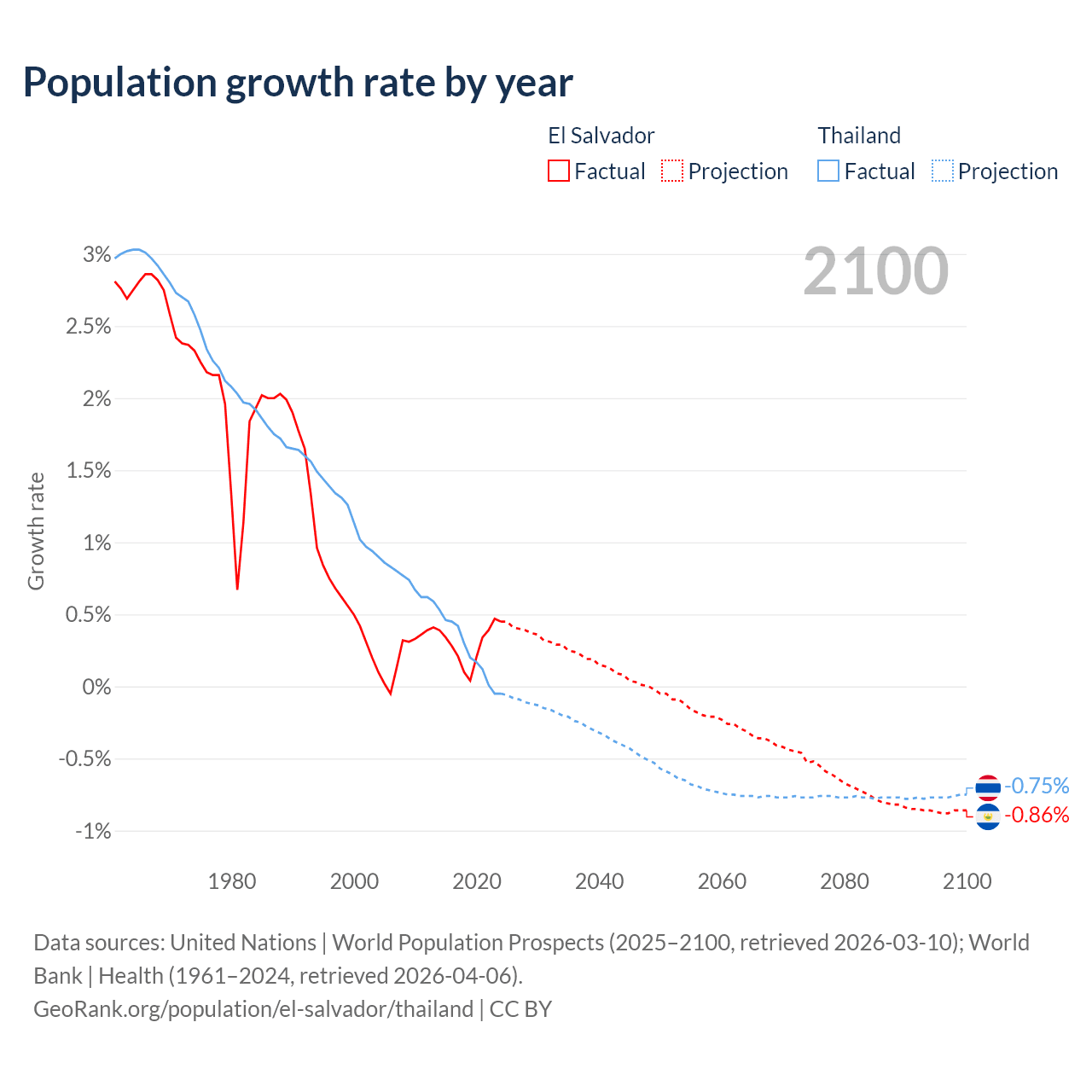 - For the last 10 years, El Salvador has had an average growth rate of +0.29% per year vs +0.23% in Thailand.