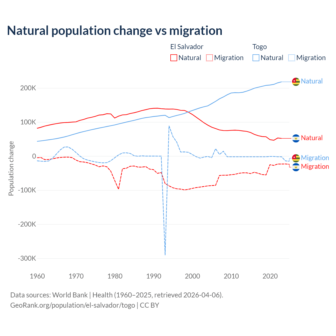 Over the last 10 years, 58.8% of the population change in El Salvador is from natural causes (a gain of 579,641 people) and 41.2% is from migration (a loss of 406,874 people). In Togo 99.1% is from natural causes (a gain of 2,052,115 people) and 0.86% is from migration (a loss of 17,852 people).