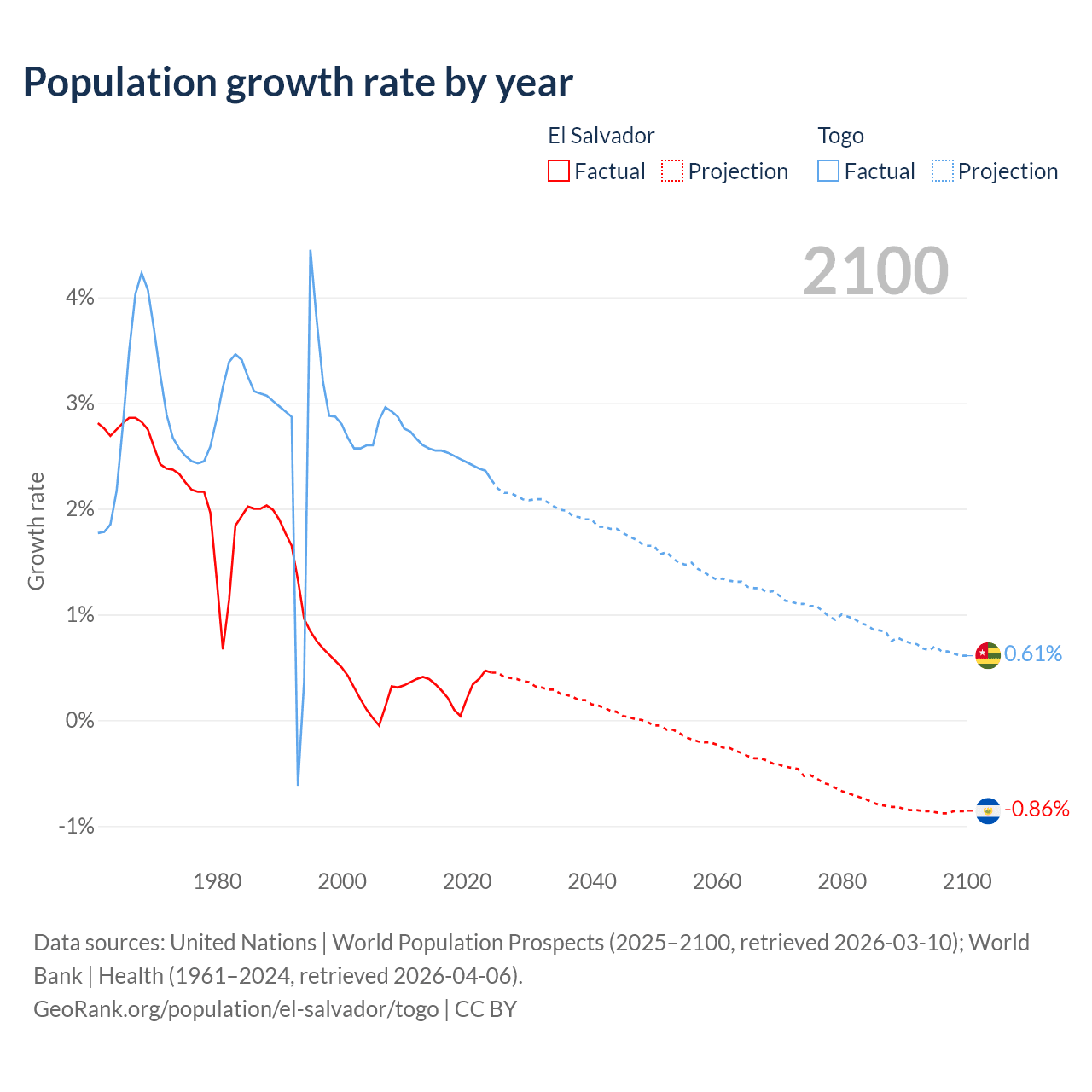 - For the last 10 years, El Salvador has had an average growth rate of +0.29% per year vs +2.46% in Togo.