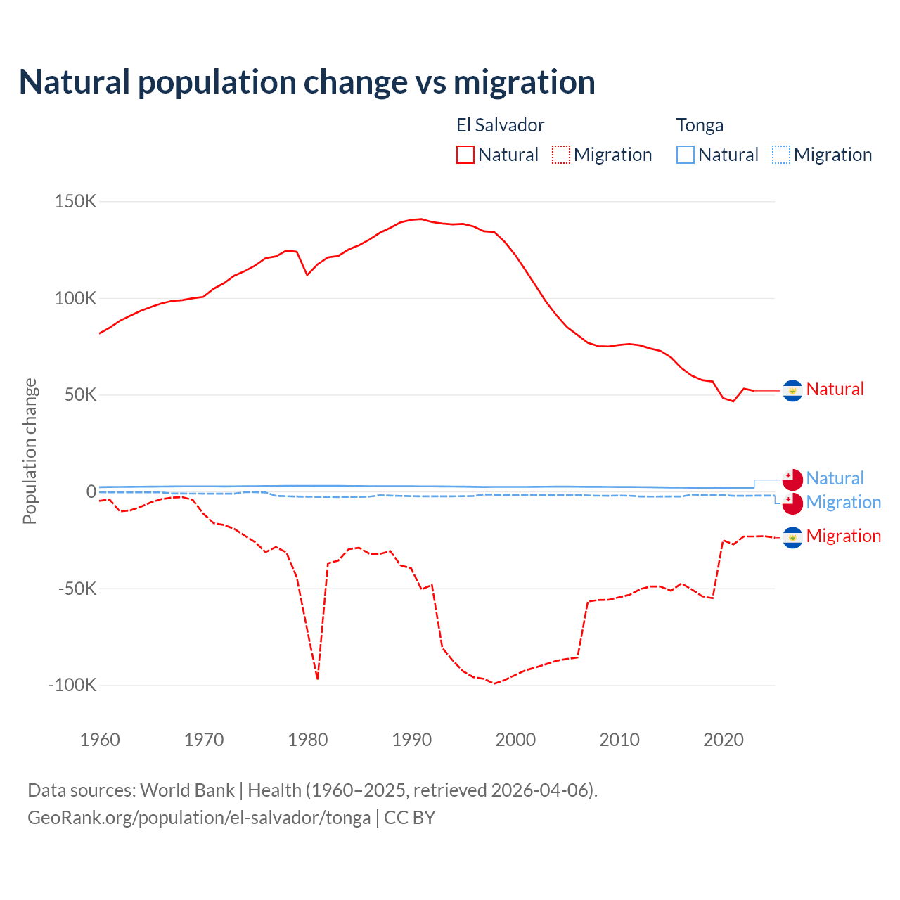 Over the last 10 years, 58.8% of the population change in El Salvador is from natural causes (a gain of 579,641 people) and 41.2% is from migration (a loss of 406,874 people). In Tonga 46.9% is from natural causes (a gain of 18,919 people) and 53.1% is from migration (a loss of 21,384 people).