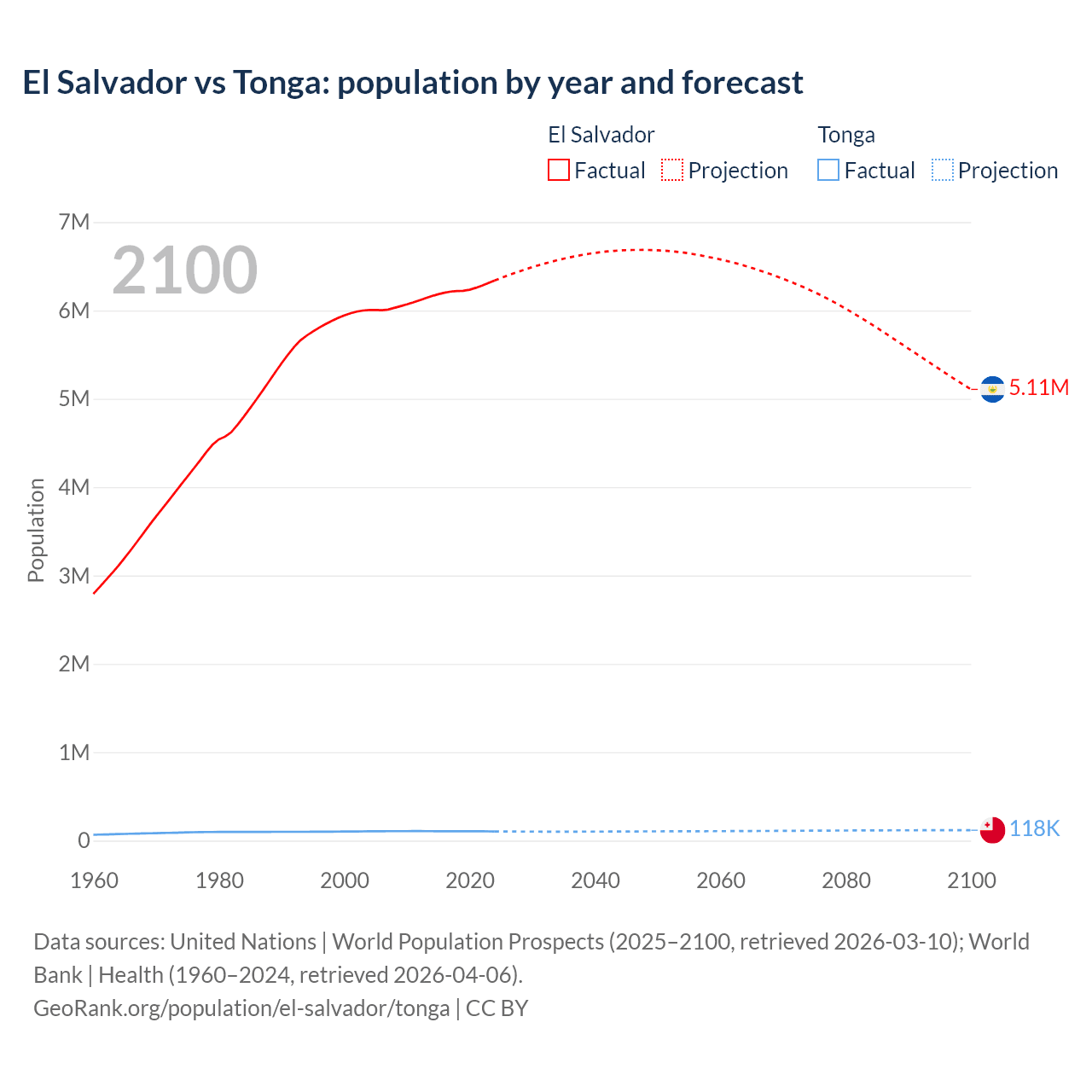 El Salvador vs Tonga: population by year and forecast