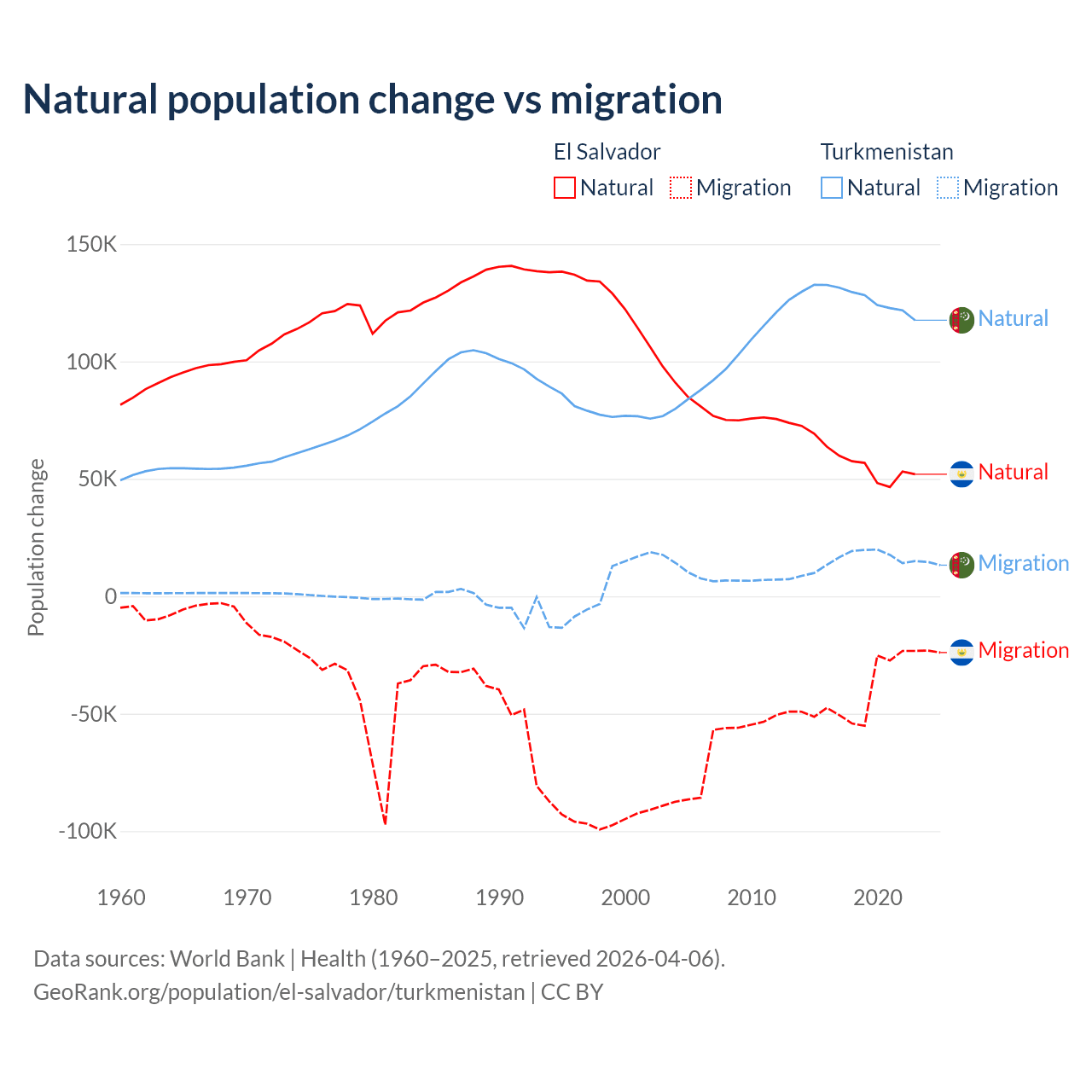 Over the last 10 years, 58.8% of the population change in El Salvador is from natural causes (a gain of 579,641 people) and 41.2% is from migration (a loss of 406,874 people). In Turkmenistan 89.2% is from natural causes (a gain of 1,270,228 people) and 10.8% is from migration (a gain of 154,379 people).