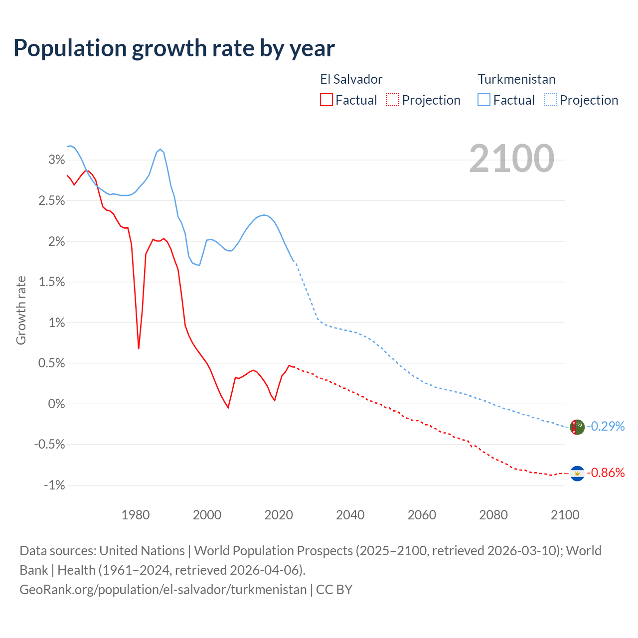- For the last 10 years, El Salvador has had an average growth rate of +0.29% per year vs +2.14% in Turkmenistan.