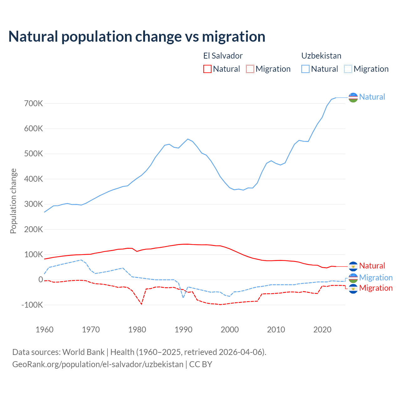 Over the last 10 years, 58.8% of the population change in El Salvador is from natural causes (a gain of 579,641 people) and 41.2% is from migration (a loss of 406,874 people). In Uzbekistan 98.2% is from natural causes (a gain of 6,161,117 people) and 1.84% is from migration (a loss of 115,398 people).