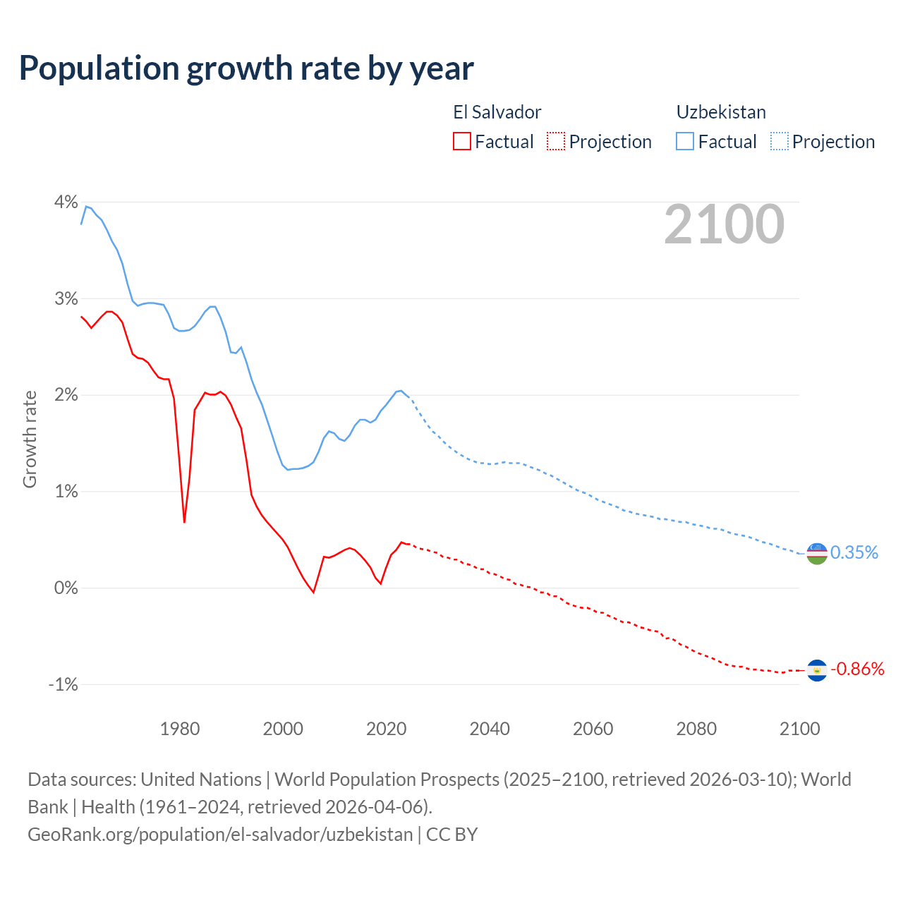 - For the last 10 years, El Salvador has had an average growth rate of +0.29% per year vs +1.85% in Uzbekistan.