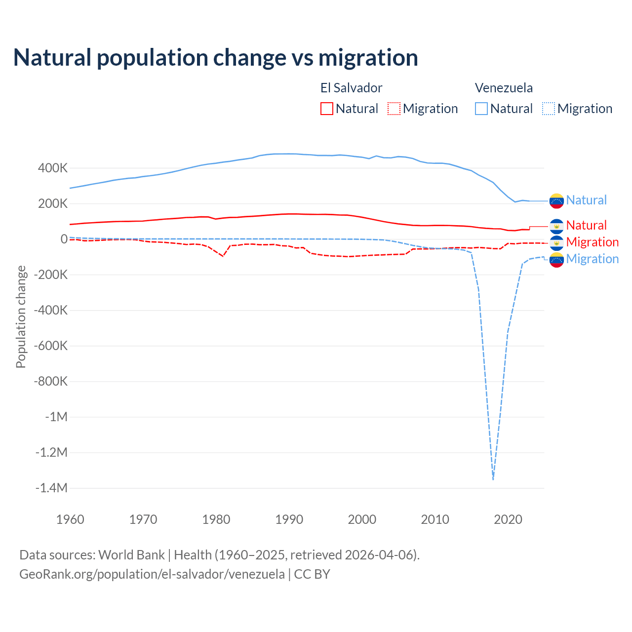 Over the last 10 years, 58.8% of the population change in El Salvador is from natural causes (a gain of 579,641 people) and 41.2% is from migration (a loss of 406,874 people). In Venezuela 38.6% is from natural causes (a gain of 2,946,257 people) and 61.4% is from migration (a loss of 4,683,227 people).